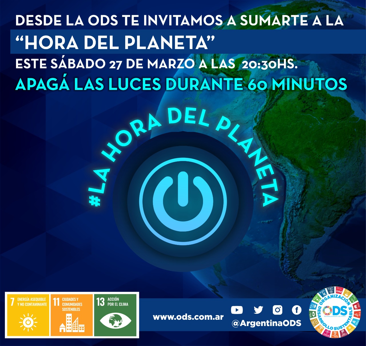 Desde Argentina Ods te invitamos a sumarte a la movida global #LaHoraDelPlaneta. Este sábado 27 de marzo forma parte del evento climático más importante del año A las 20.30 hs. apagá las luces durante 60 minutos por nuestra Casa Común, el Planeta.